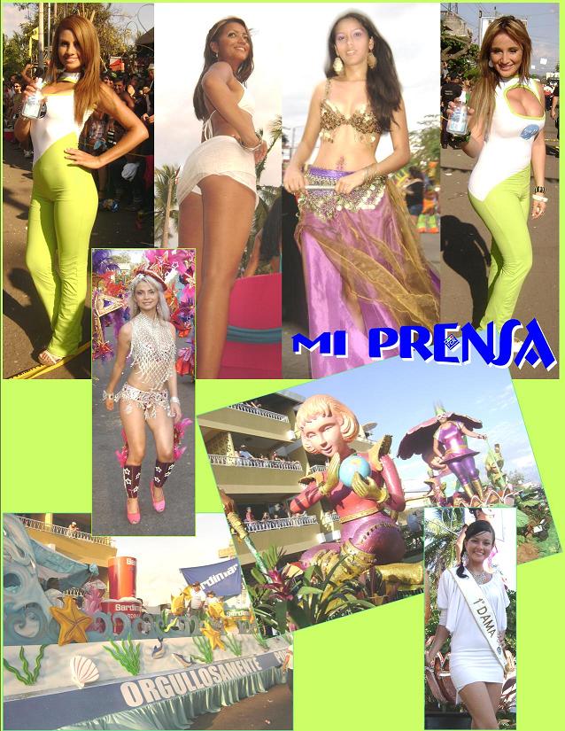 Para enamorarse en Puntarenas. En los extremos arriba: Las modelos nunca pueden faltar en el carnaval, aquí dos que promocionaban una marca comercial. Al centro arriba: esta chica iba en la carroza de la UMCA y demostró tener hermoso derrier. Lourdes de la Academia de Danza Shamzia de Esparza, buenas curvas. Marta, la chica rubia de abajo a la izquierda, despabiló a más de uno, con el poco vestuario. Radiante de blanco: así lució Mariángel Cerdas la Primera Dama del reinado. Abajo: Carroza de Sardimar y la de Kolbi del ICE. Fotos: Franklin Castro, Mi Prensa.