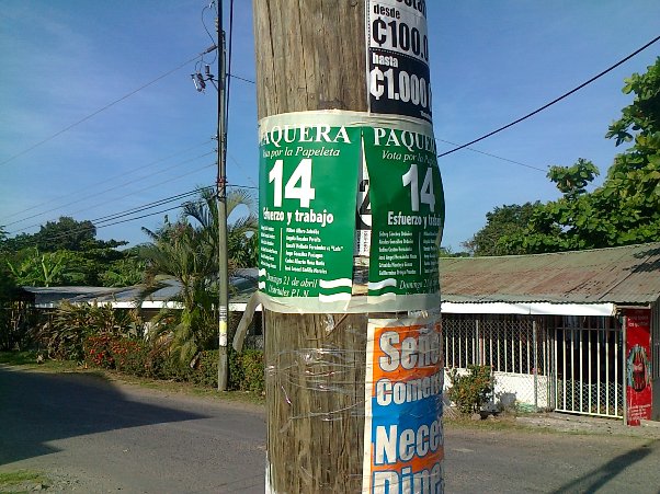 Esta propaganda estaba pegada en postes en Paquera, esta mañana de miércoles 17 de abril 2013. Foto Franklin Castro, Mi Prensa.